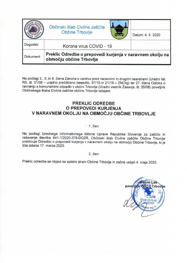 Preklic Odredbe o prepovedi kurjenja v naravnem okolju v Občini Trbovlje