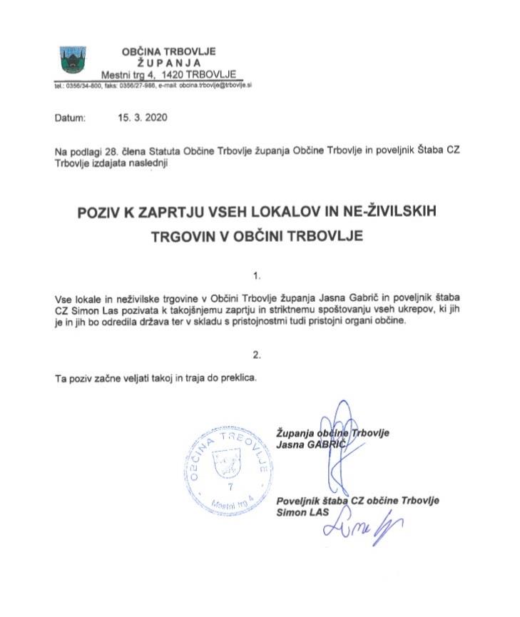 Poziv k zaprtju vseh lokalov in neživilskih trgovin