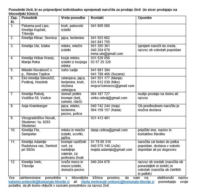 V kolikor bi posamezniki želeli kupovati izdelke lokalnih ponudnikov, pa bomo v prihodnjih dneh objavili kontakte ponudnikov, s katerimi se bo mogoče dogovoriti za individualno prodajo.