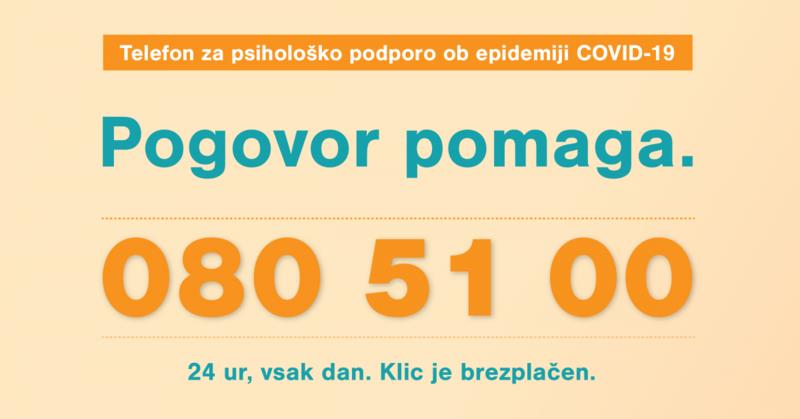 Vzpostavljen je Telefon za psihološko podporo prebivalcem ob epidemiji COVID-19. Na brezplačni telefonski številki 080 51 00 bodo 24 ur na dan, vse dni v tednu strokovno pomoč nudili izkušeni psihologi, psihoterapevti in drugi strokovnjaki s področja duševnega zdravja.