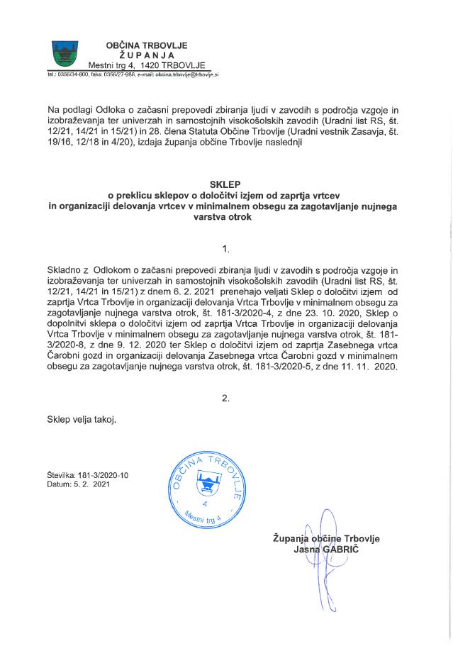 Sklep o preklicu sklepov o določitvi izjem od zaprtja vrtcev in organizaciji delovanja vrtcev v minimalnem obsegu za zagotavljanje nujnega varstva otrok